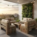 Foto realista de pequeno quintal com horta vertical em parede de pallets.